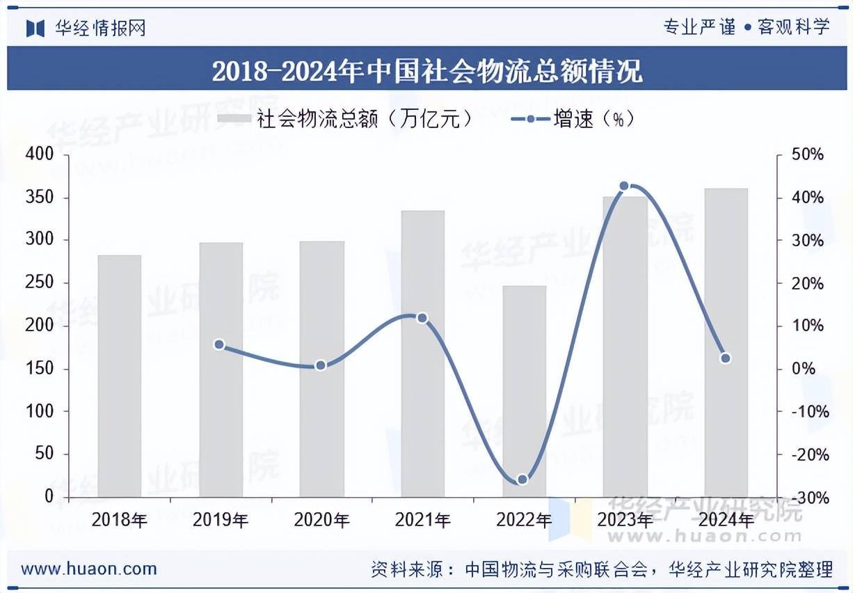 码垛机器人主要归属于物流自动化设备行业,是集成化技术的重要代表。因此下游物流市场对其的影响较大。近年伴随着工业品、农产品、进口货物、单位与居民物品等对社会物流总需求稳步增长,我国社会物流总额呈现逐年上升态势。据统计,截至2024年我国社会物流总额为360.6万亿元,同比增长5.8%。